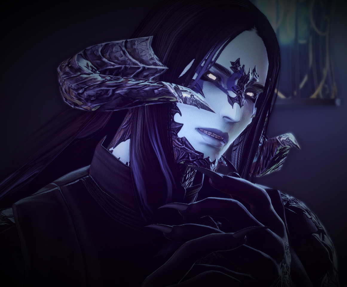 As he ventured out into Eorzea, he researched the dark condition that had dismantled his life thus far. By perusing extensive libraries and exploring ancient ruins he managed to piece together a way of holding off the affliction and the hungers it unleashed. He learned that his soul had somehow become corrupted with influence from the Void, giving him both dark empathy and a craving for aether. He traveled across the lands, encountering dragons in Dravania that taught him how to further control his emotional volatility. He had also discovered scattered ruins of both Mhachi and Allagan origins, and felt the void energy pull him in and speak to him more intimately, softly, compellingly, meeting his senses with clarity that his latent Void affliction lacked. He spoke to the entities from the beyond, learning how the dark tint on his soul could be a boon, rather than a bane. And so he began to learn Void-Summoning; clumsy and reckless at first, but quickly developing into a skilled student in the dark art.Later discovering Idyllshire, he picked up the art of the Sage and devoured the literature and knowledge left behind by the Sharlayan exodus. He learned much from the world around him, grew to value knowledge and art and culture, and became a mercenary for hire, hunting monsters and defending caravans.[A Gilded Cage - Ishgard]