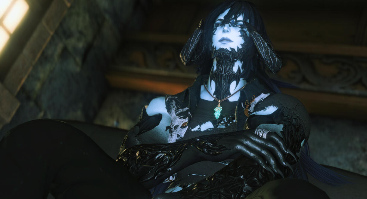 As he ventured out into Eorzea, he researched the dark condition that had dismantled his life thus far. By perusing extensive libraries and exploring ancient ruins he managed to piece together a way of holding off the affliction and the hungers it unleashed. He learned that his soul had somehow become corrupted with influence from the Void, giving him both dark empathy and a craving for aether. He traveled across the lands, encountering dragons in Dravania that taught him how to further control his emotional volatility. He had also discovered scattered ruins of both Mhachi and Allagan origins, and felt the void energy pull him in and speak to him more intimately, softly, compellingly, meeting his senses with clarity that his latent Void affliction lacked. He spoke to the entities from the beyond, learning how the dark tint on his soul could be a boon, rather than a bane. And so he began to learn Void-Summoning; clumsy and reckless at first, but quickly developing into a skilled student in the dark art.Later discovering Idyllshire, he picked up the art of the Sage and devoured the literature and knowledge left behind by the Sharlayan exodus. He learned much from the world around him, grew to value knowledge and art and culture, and became a mercenary for hire, hunting monsters and defending caravans.[A Gilded Cage - Ishgard]