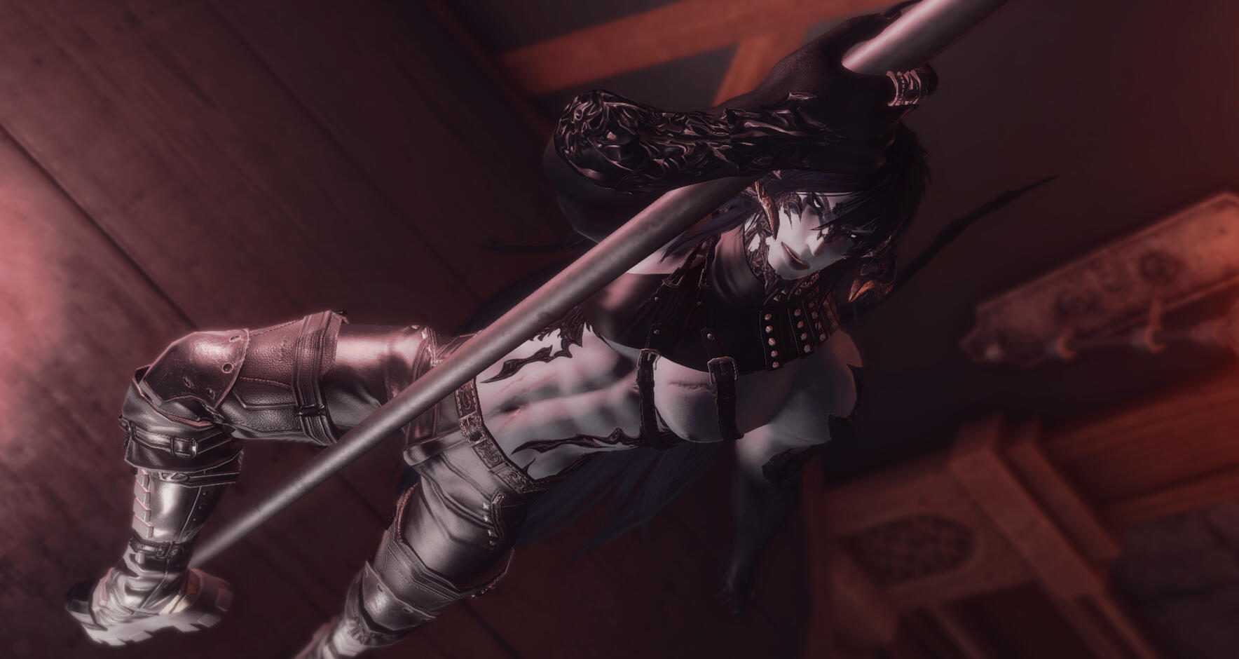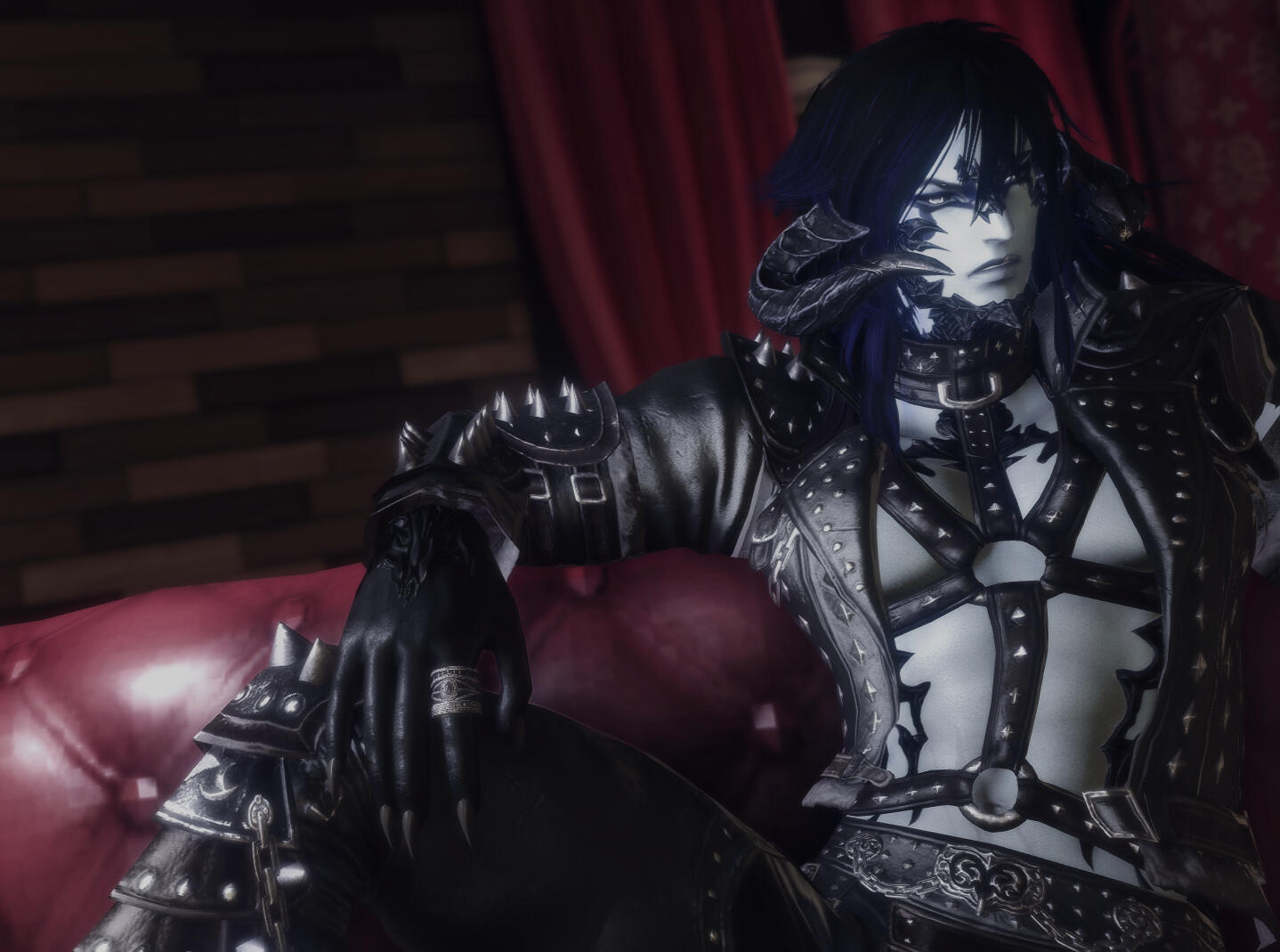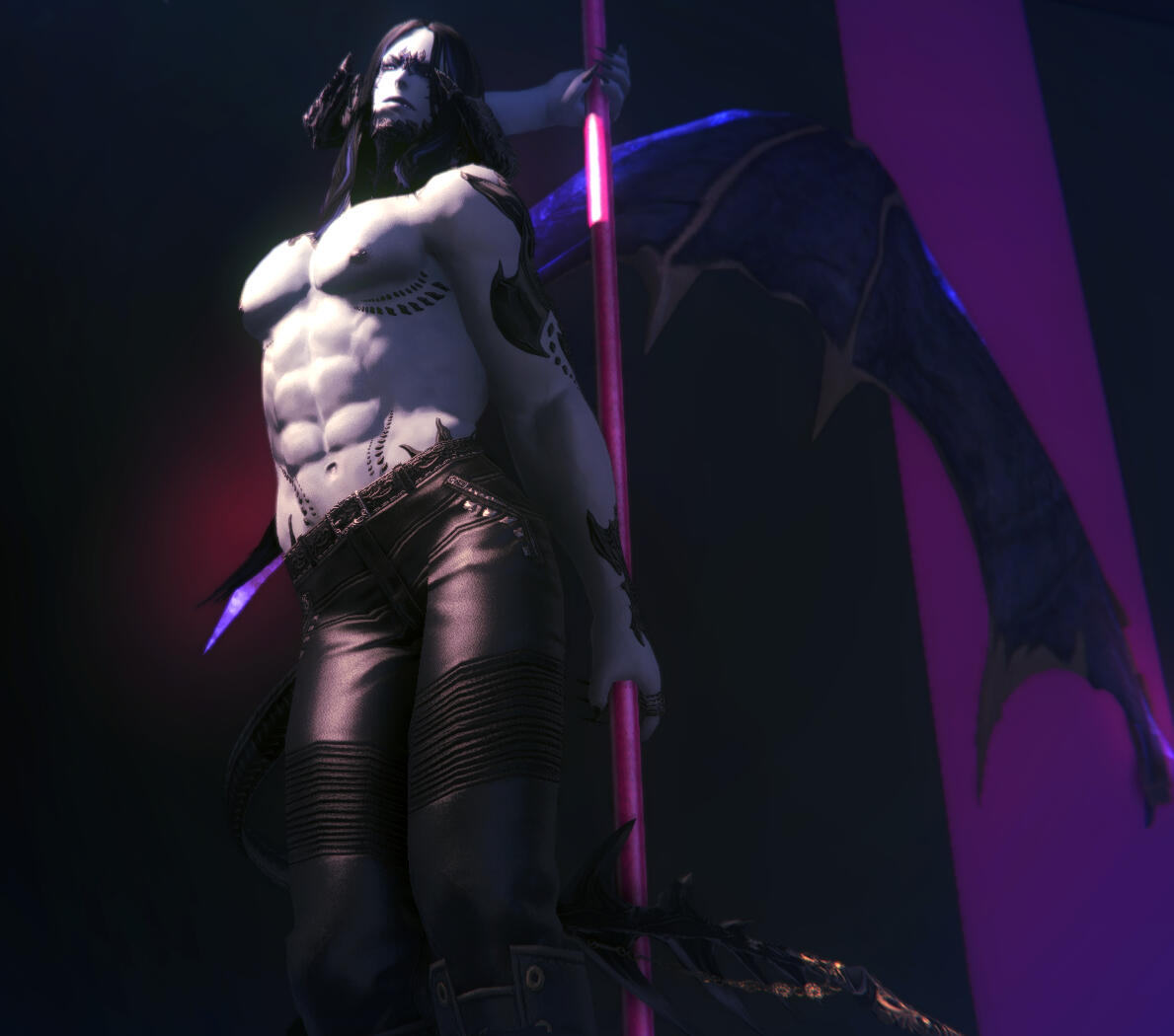 ...BODY TYPE....This Xaela has moonlight-silver skin, with a form honed by a difficult life of labor and warfare -- chiseled muscle and sinew mixed with significant bulk, especially along his pectorals, arms, and glutes. He stands a little over the height of an average Xaela, at about 7 fulms....HAIR....His raven hair is ridiculously long and straight and flows far past his waist, and sports subtle blue highlights within the waves. It has a tendency to tangle, so he sometimes wears it up in a long ponytail or single braid....EYES.... He has an intense stare with irises as white as Ishgardian snow, black sclera and slightly glowing limbal rings....FASHION.... Preferring monochromatic or dark styles, Morahkiev wears a lot of tight black leather, especially to his nightclub venues. When adventuring, his armor is light and utilitarian, drab and dark in hue. When in a more casual state, he wears loose tunics and baggy pants, often in Eastern styles popular in Kugane....UNIQUE FEATURES.... His scales are thick, deep black, and covering more of his flesh than a typical Xaela. His horns are large and curved, sharped on the tips with metal ornaments. His tail is long and sinuous, as well as prehensile. His silver flesh is marred with various scarring, both slashes and patches of damaged skin. Dark mottling covers his lower arms and fingertips, and he has long black claws on his fingers and pointed canines in his crooked smile.