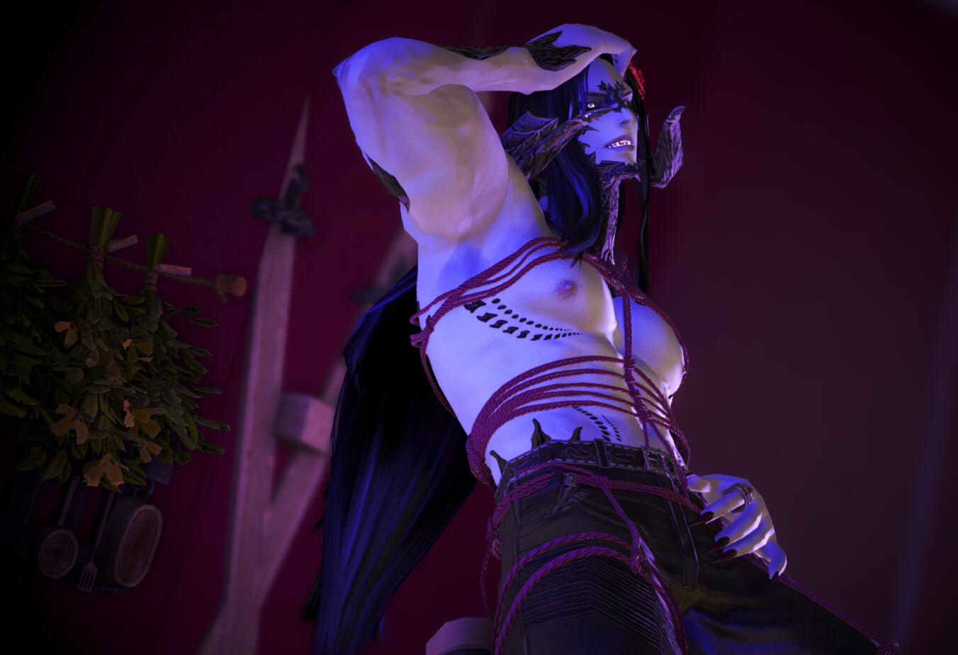 Morahkiev moved to Ul'Dah to start his new life, joining the Immortal Flames and various mercenary groups to defend Thanalan from various threats, and do odd jobs such as guarding caravans and doing merchants' dirty work. This was quite a bit of toil however, and eventually Morahkiev found his calling in sex work as an escort and professional Dom in the various local kink scenes. This was a way to pick up ambient aether from his partners to stave off his affliction, and sated his extroversion and hedonism. Over time he developed a network of both mercenary contacts and venues, traveling around constantly as demand called for him and following his lusts and instincts. He has lived this way for a few years now, saving up a nest-egg of gil and living life to the fullest, holding off his curse and valuing the close connections he can form with others.